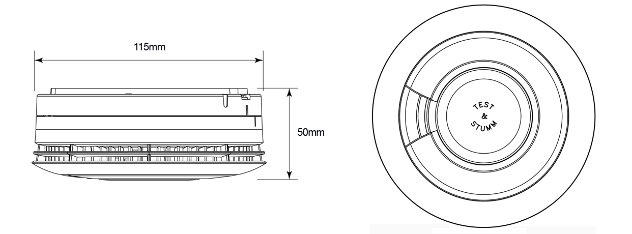 - Großer Test-/ Stummschaltknopf (Bedienung ohne Leiter vom Boden aus)